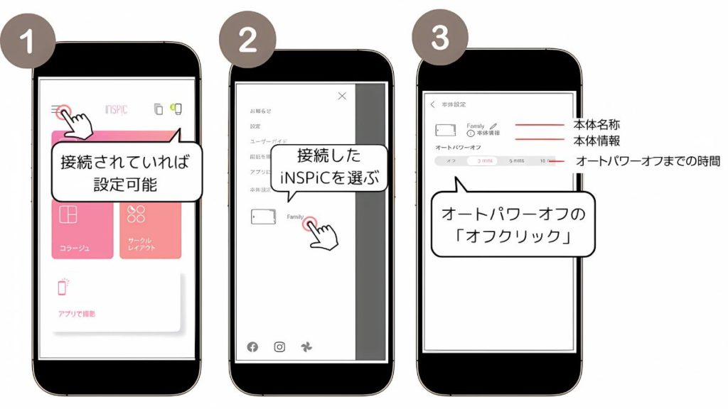 iNSPiCの電源ボタンを長押しして、電源を入れます。