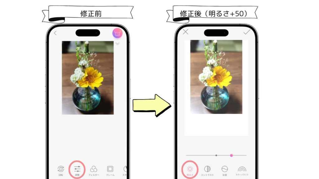 今回は分かりやすいように明るさのみ変更しましたが、コントラスト・彩度・カラーバランスも調整できます🌸